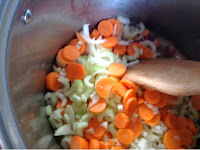 I slowly added milk, stirring, until I had added all that was required, then I threw in celery leaves, carrot pieces, a halved onion, and a couple of cloves.